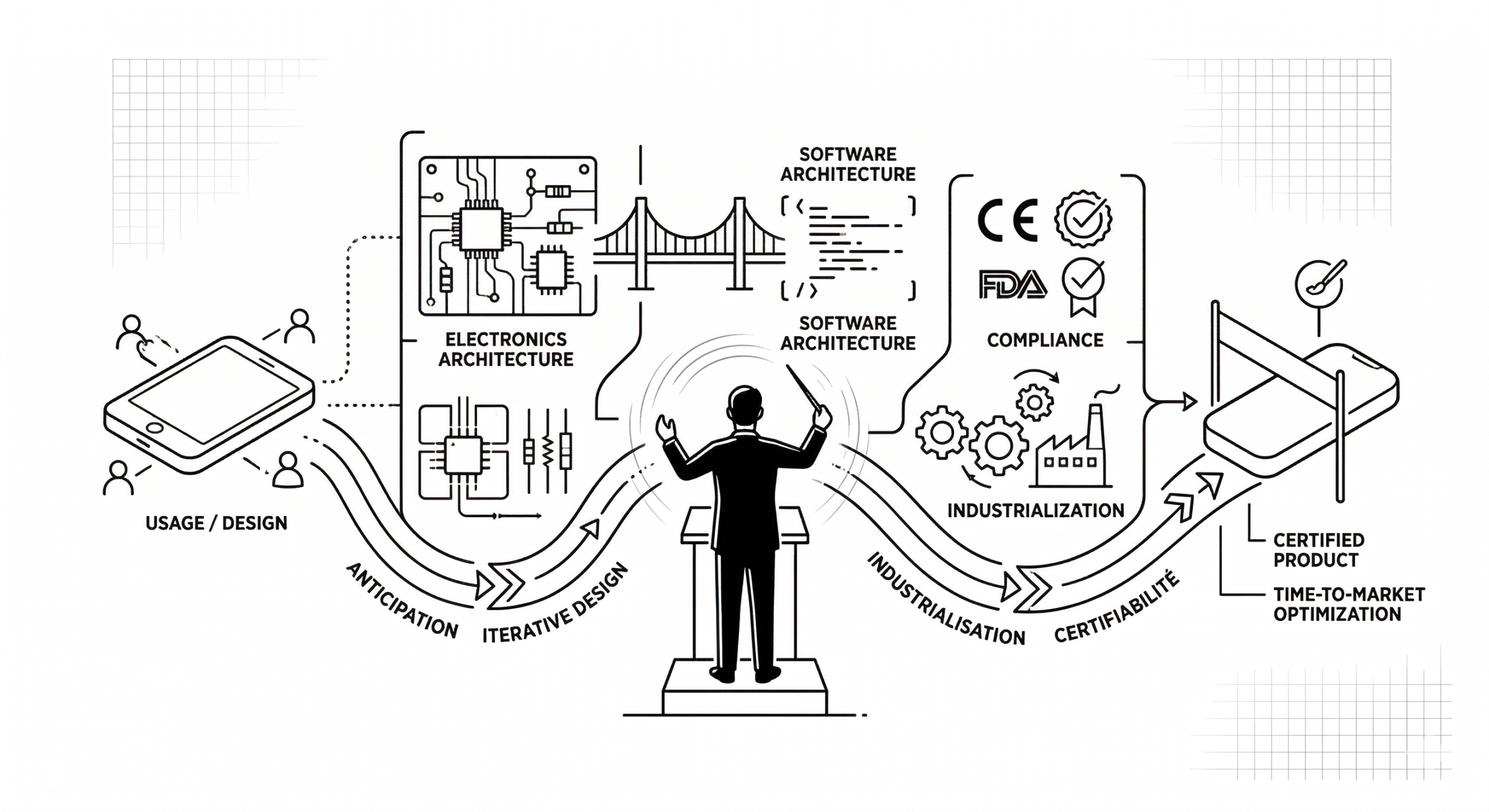 En verrouillant la viabilité industrielle et normative dès la phase de définition, nous éliminons les risques de refontes tardives, sécurisons vos investissements et garantissons un Time-to-Market optimisé. »